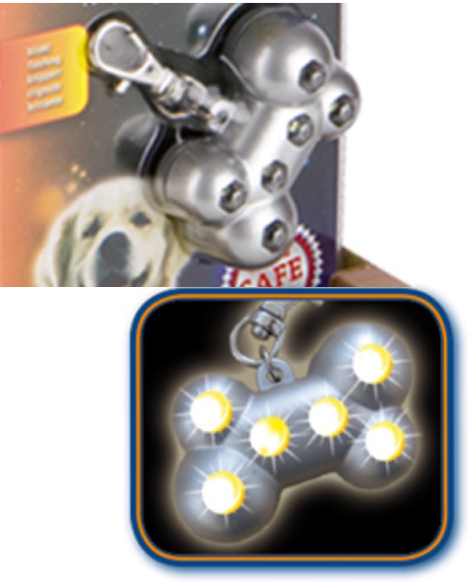 Dekorativer Anhänger für Spaziergänge mit dem Hund in der Dunkelheit spät abends im Winter oder im Sommer zu später Stunde (wenn die Luft kühler ist) sind oft unumgänglich. Blinky-Bone schützt Ihren Hund und damit auch Sie mit leuchtenden, blinkenden und reflektierenden Effekten. Diese kleinen Anhänger zur Befestigung am Halsband überzeugen durch ihre Leuchtkraft. Blinky-Bone ist in Form eines Kauknochens gestaltet und mit sechs Leuchtdioden ausgestattet, die eine Sichtbarkeit auf bis zu 800 Metern möglich machen. Leichtes Ein-/Ausschalten sorgt für bequeme Handhabung.