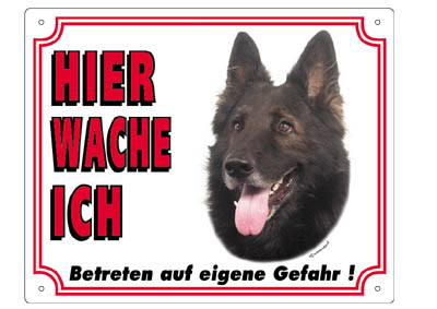 "Hier wache ich (…)" lautet die Aufschrift dieser Warntafel. Sie ist aus Kunststoff hergestellt und kann daher an vielen verschiedenen Orten, auch im Außenbereich, aufgehängt werden. Diese Ausführung zeigt das Bild eines Gronendael.